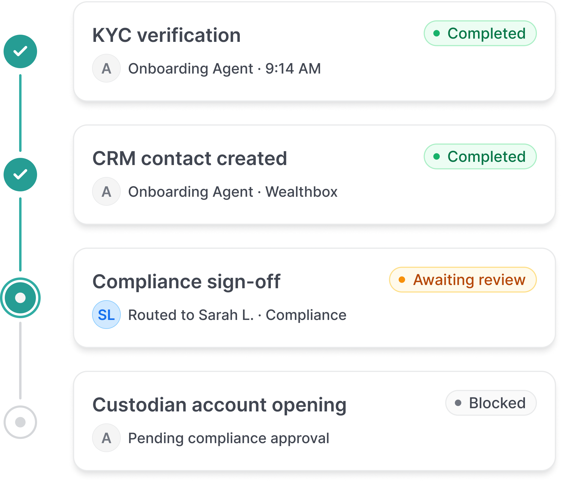 CRMs, custodians, and ops tools surface the task. They don’t complete it.