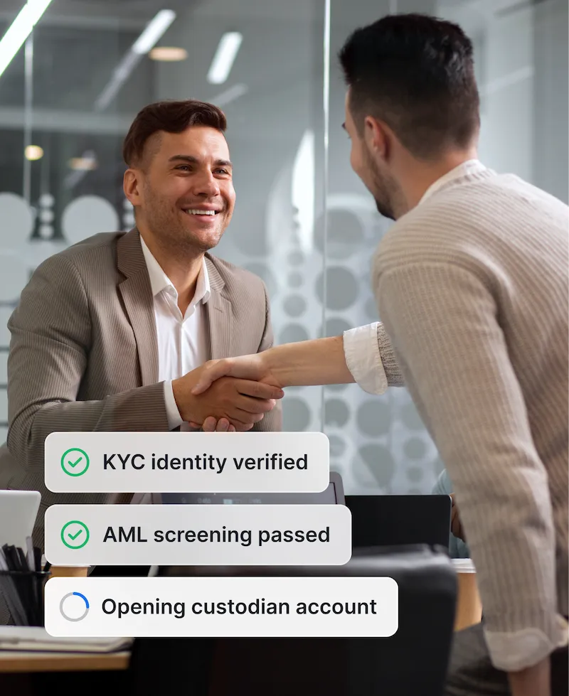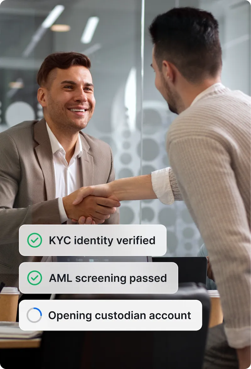 KYC, AML, account opening, document collection, and approvals completed in sequence without manual coordination.